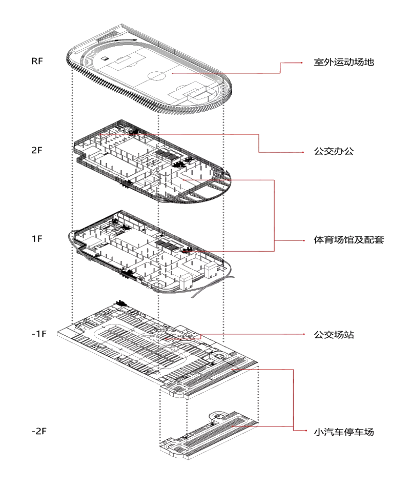 其中地下部分結(jié)合公交場站和小車庫層高的差異,在南側(cè)設(shè)置一層地下公交場站,北側(cè)設(shè)置兩層地下小汽車庫;地上部分設(shè)置體育綜合體,夾層部分利用體育場館的凈高要求,設(shè)置辦公配套區(qū)域;屋頂部分設(shè)置室外運(yùn)動(dòng)休閑廣場,提高空間利用效率。
